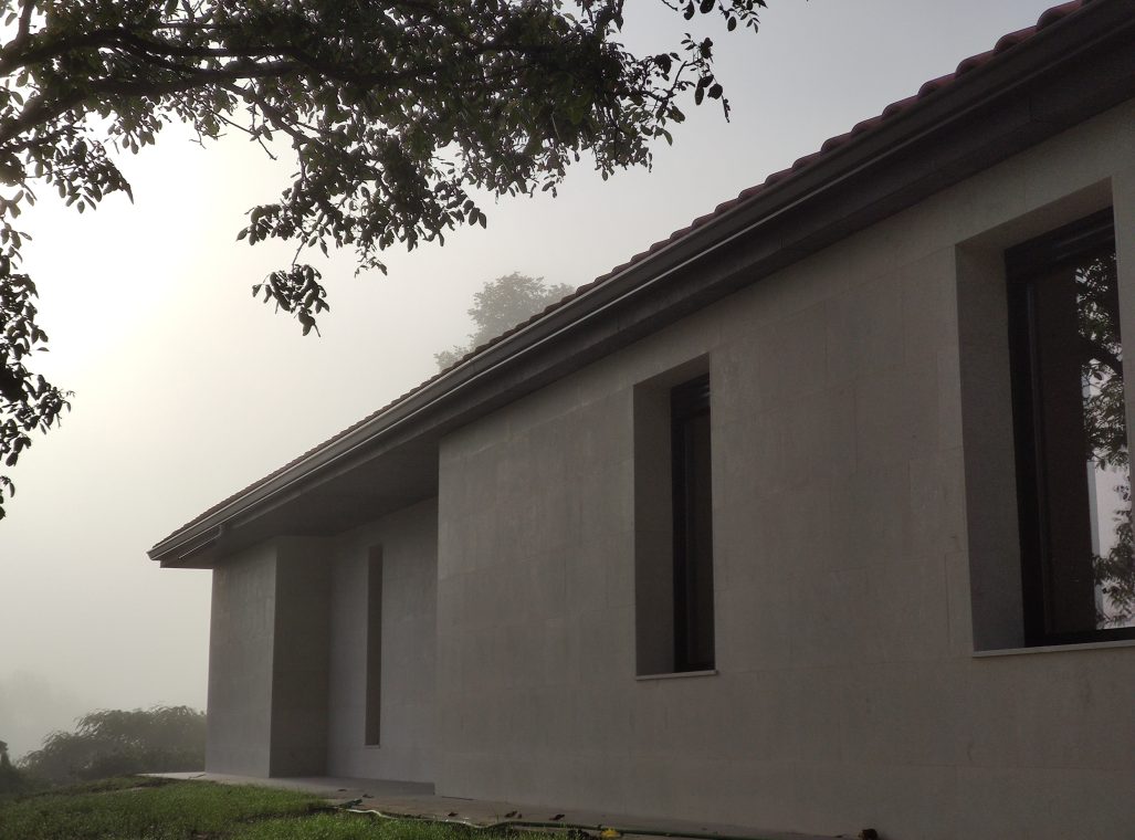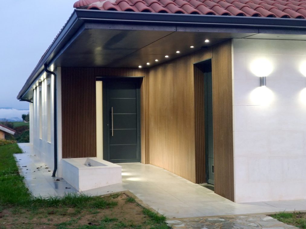 Vivienda unifamiliar acabada en piedra natural (Caliza Alba). Con porche en listones de madera (composite).