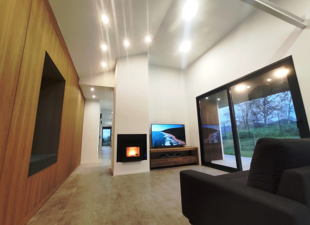 Un perfecto aislamiento combinado con un sistema de calefacción por suelo radiante hacen de la vivienda una construcción eficiente y de muy bajo impacto. El insertable de pellet añade una calidez inigualable.
