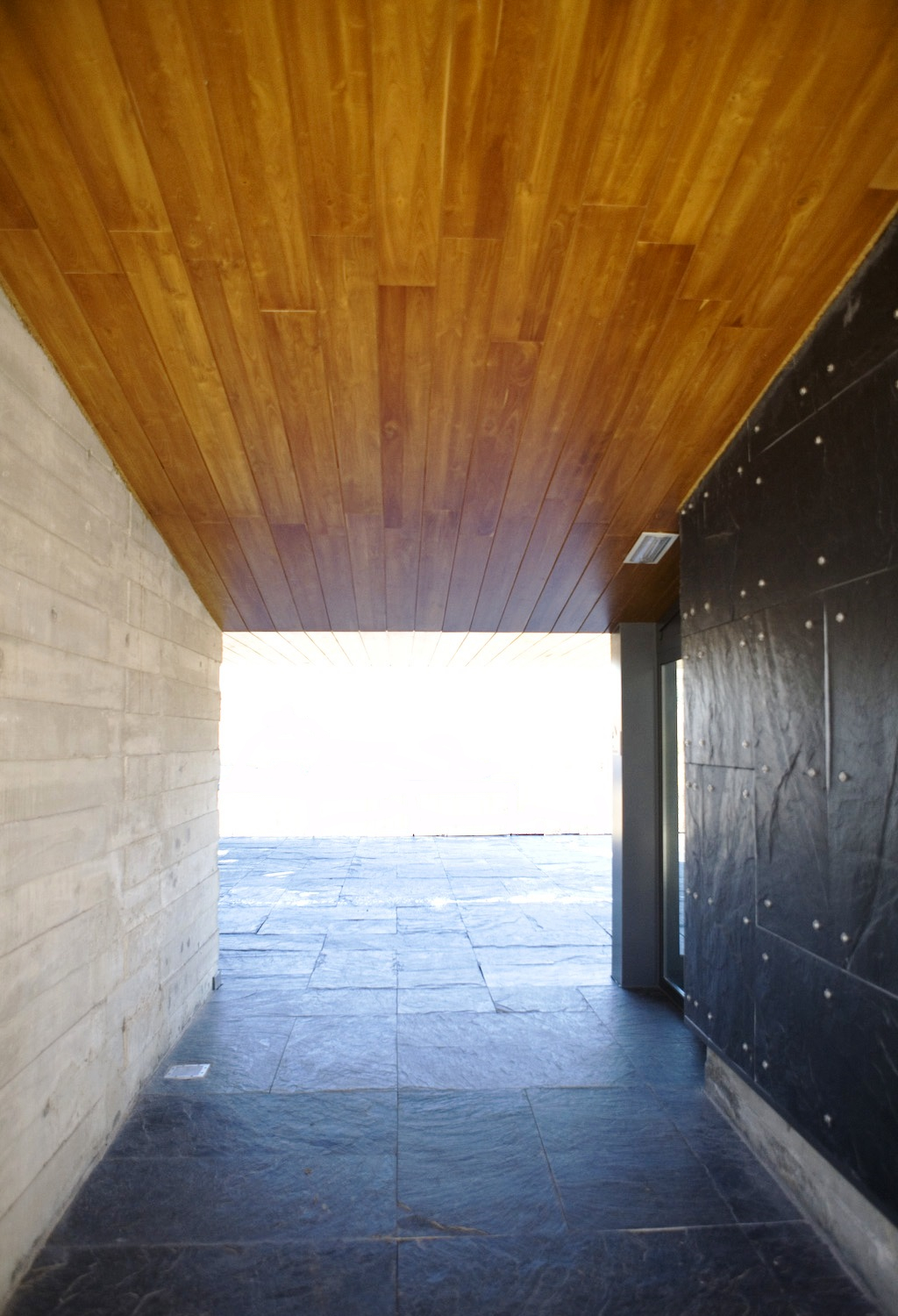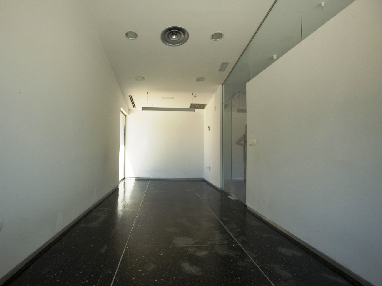 Suelos en hormigón pulido. Terrazo «in situ». Divisiones en vidrio. Módulos interiores en madera de roble o castaño. Enormes puertas pivotantes. Construcción con accesos abiertos.